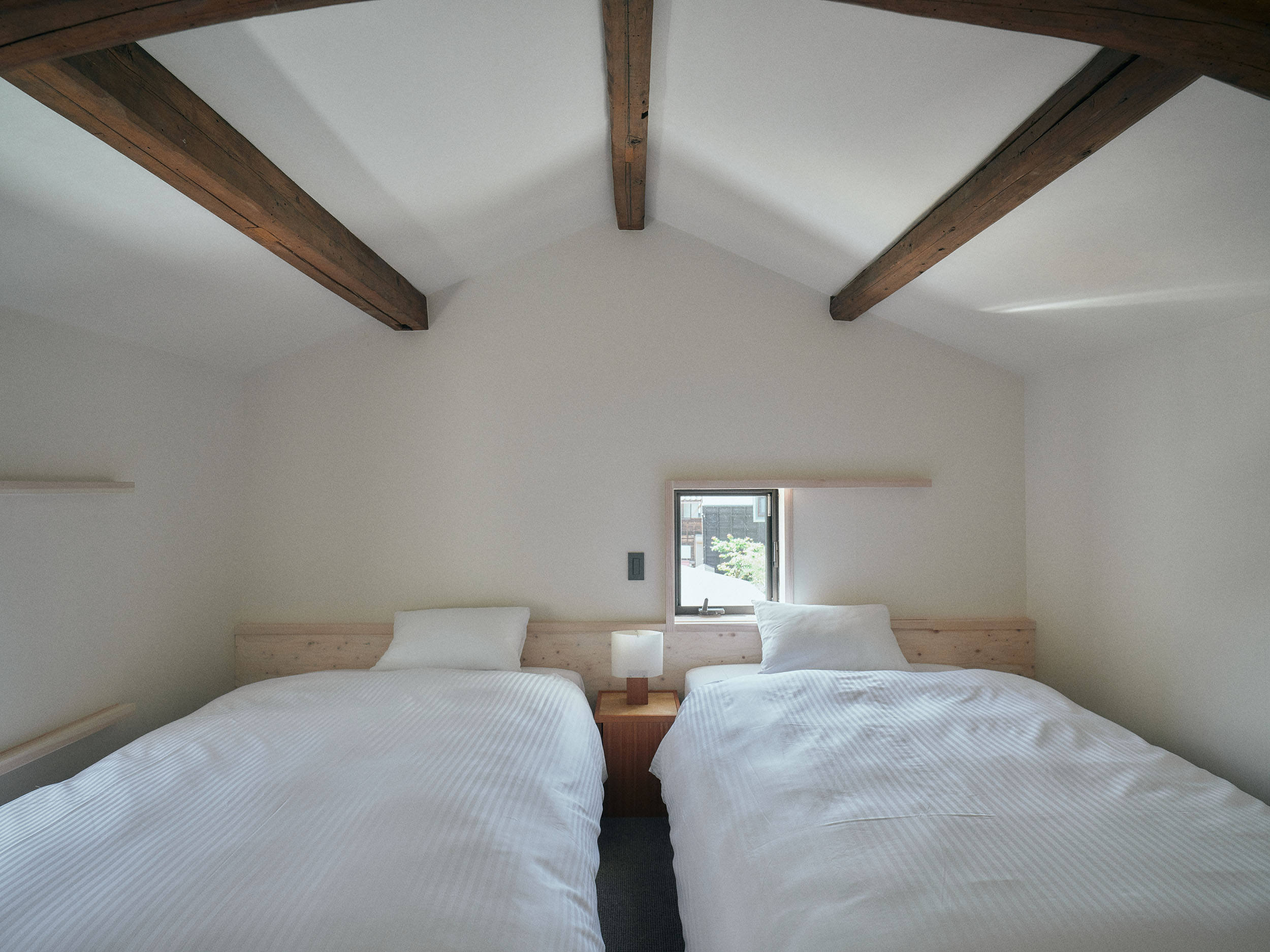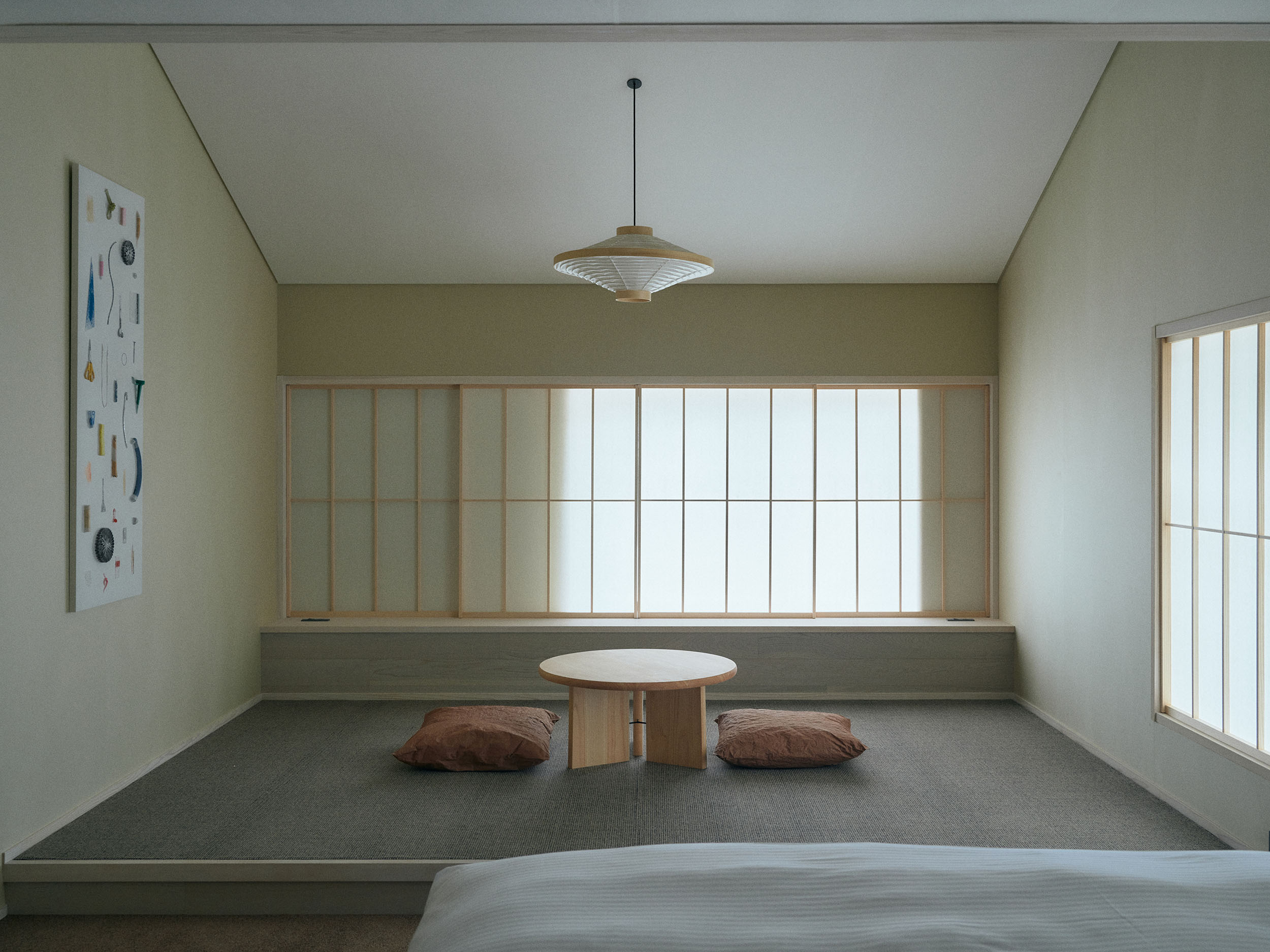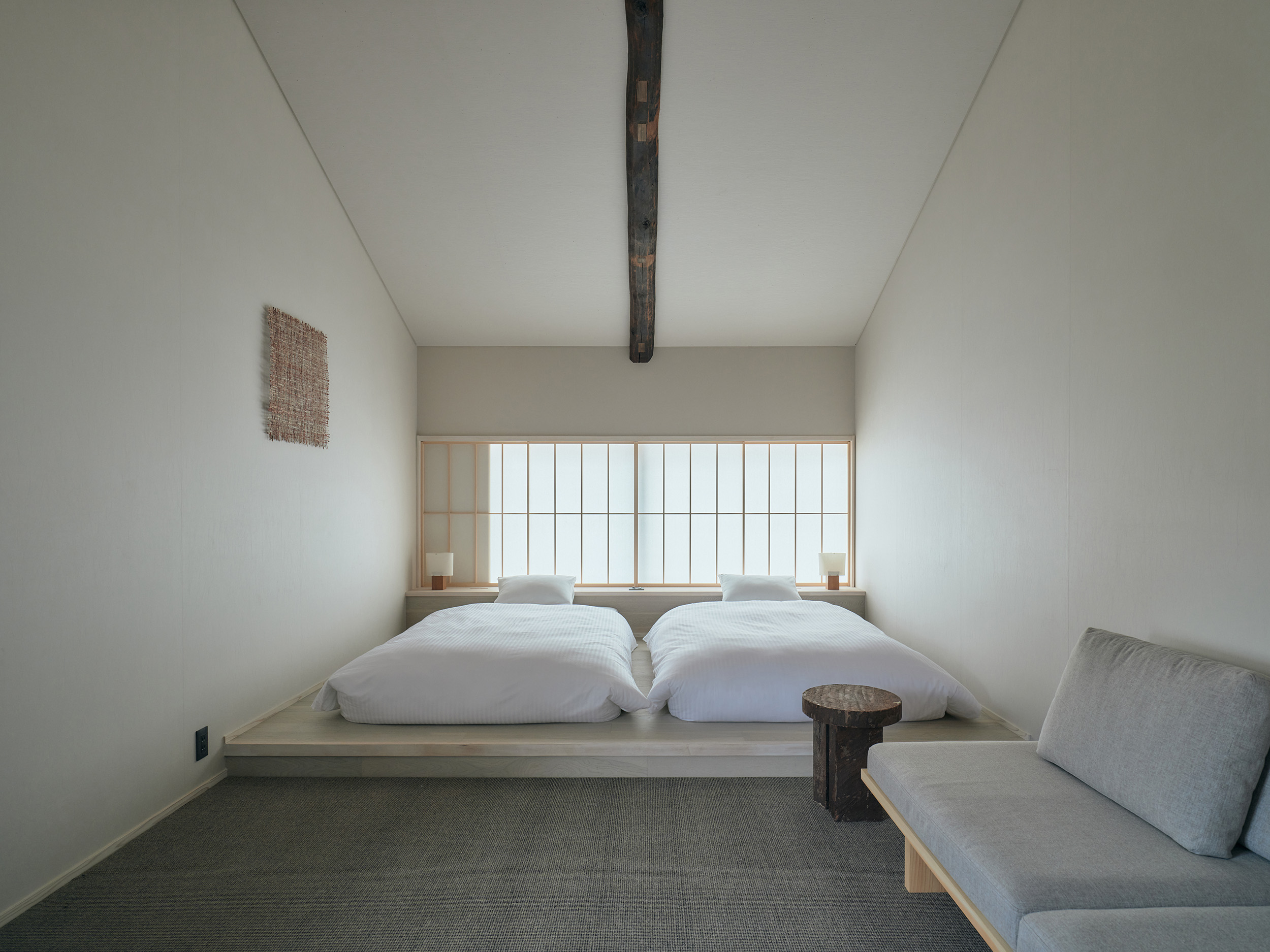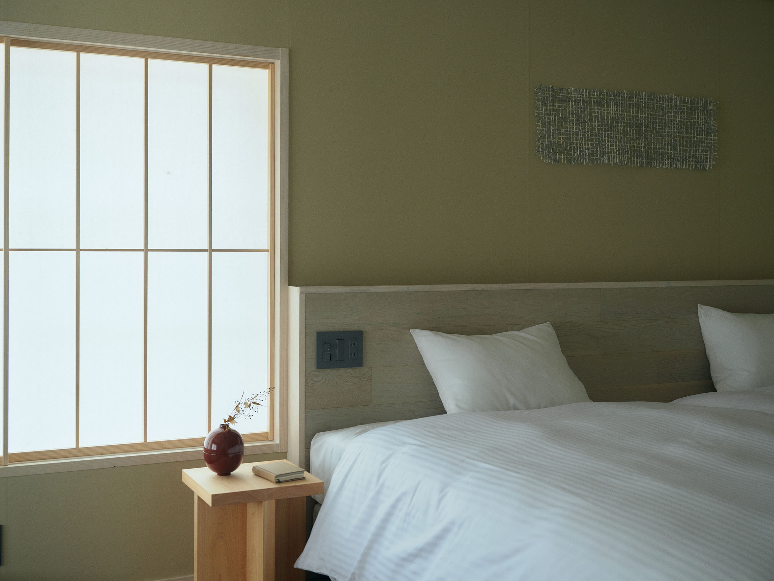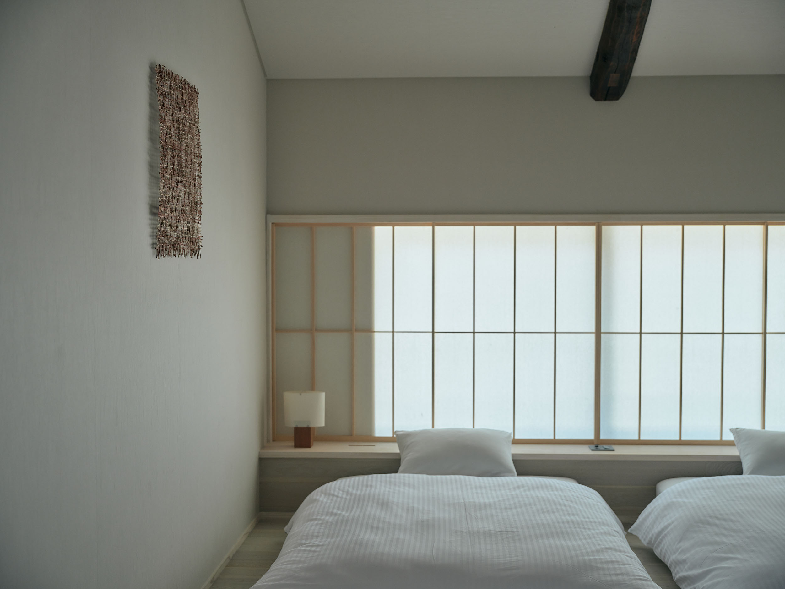 2人での滞在におすすめの「楮」は、二階の大きな窓から成願寺の参道を望み、光と風が心地よく通り抜けます。室内には、紙漉き道具を漉き込んだ滝製紙所・瀧英晃氏のアートワークが飾られ、和紙の息づかいを感じる空間となっています。