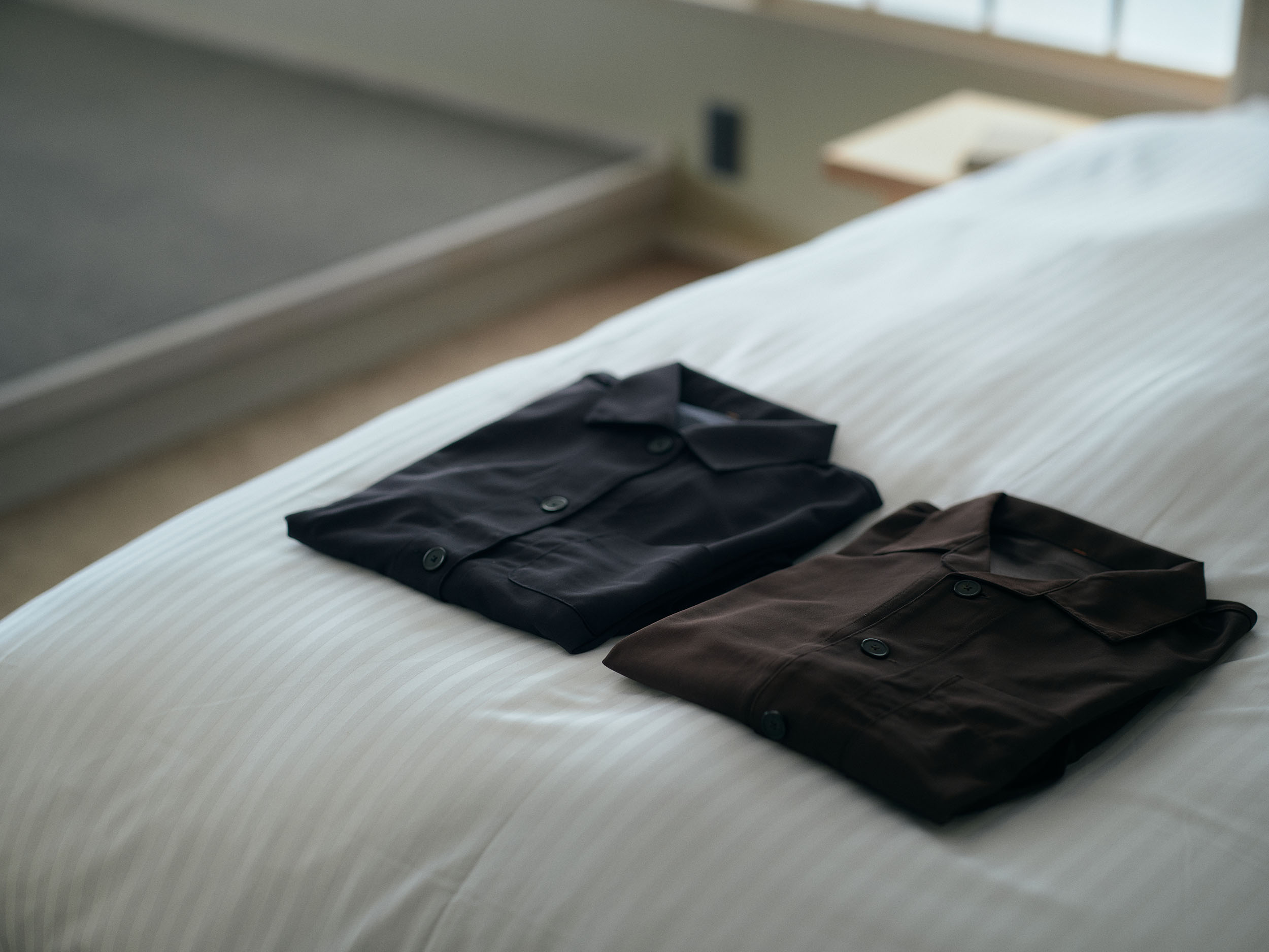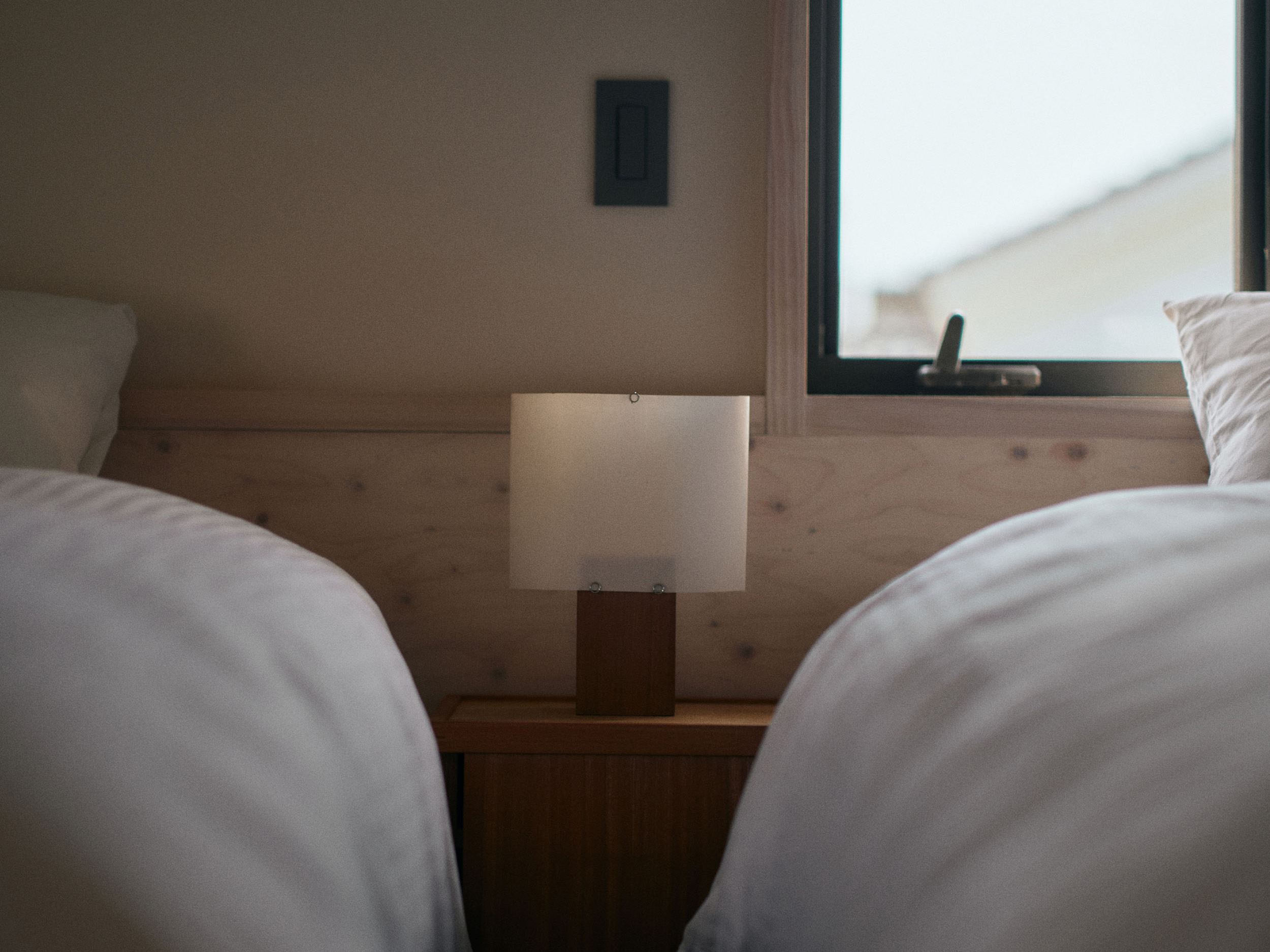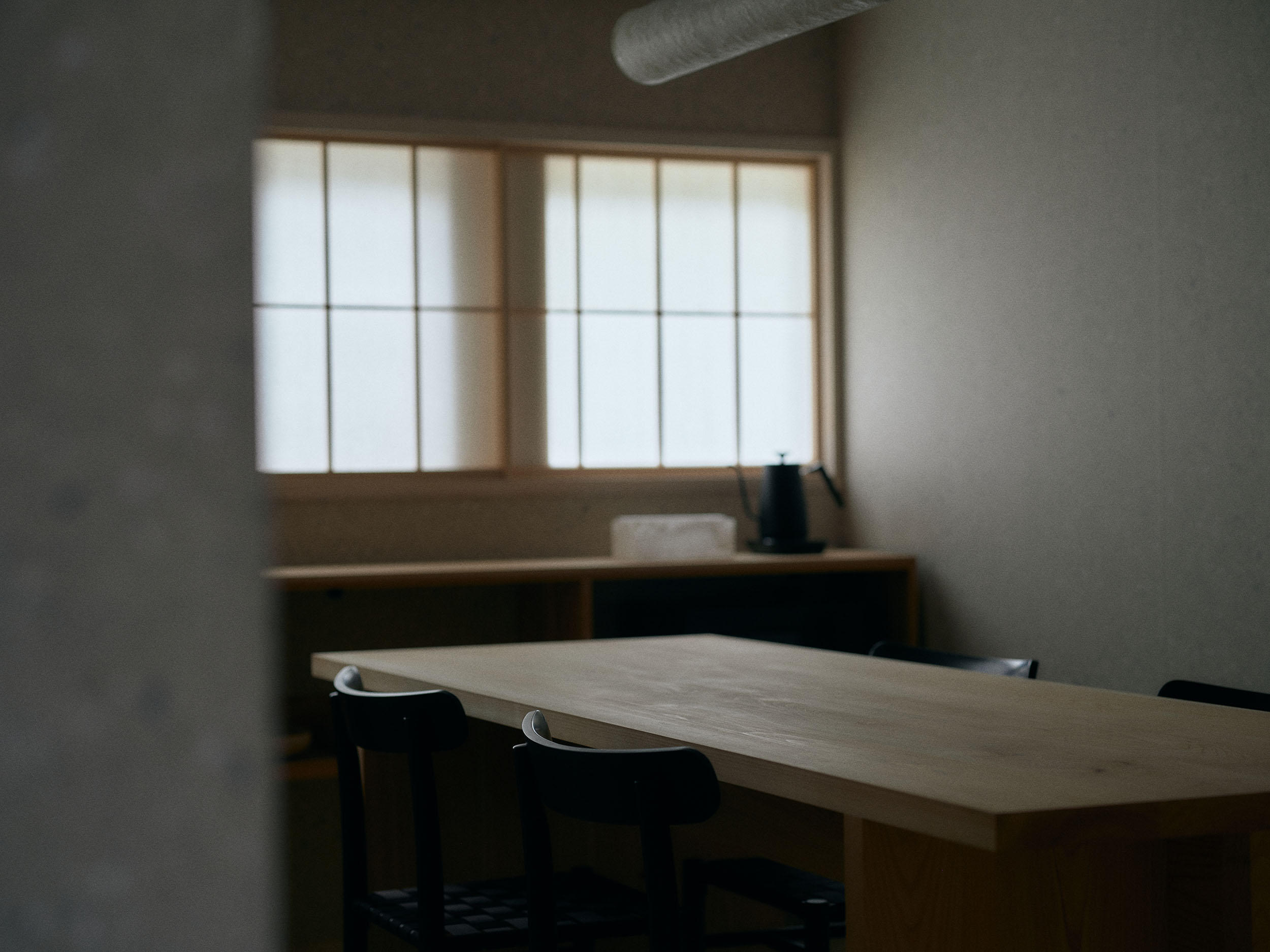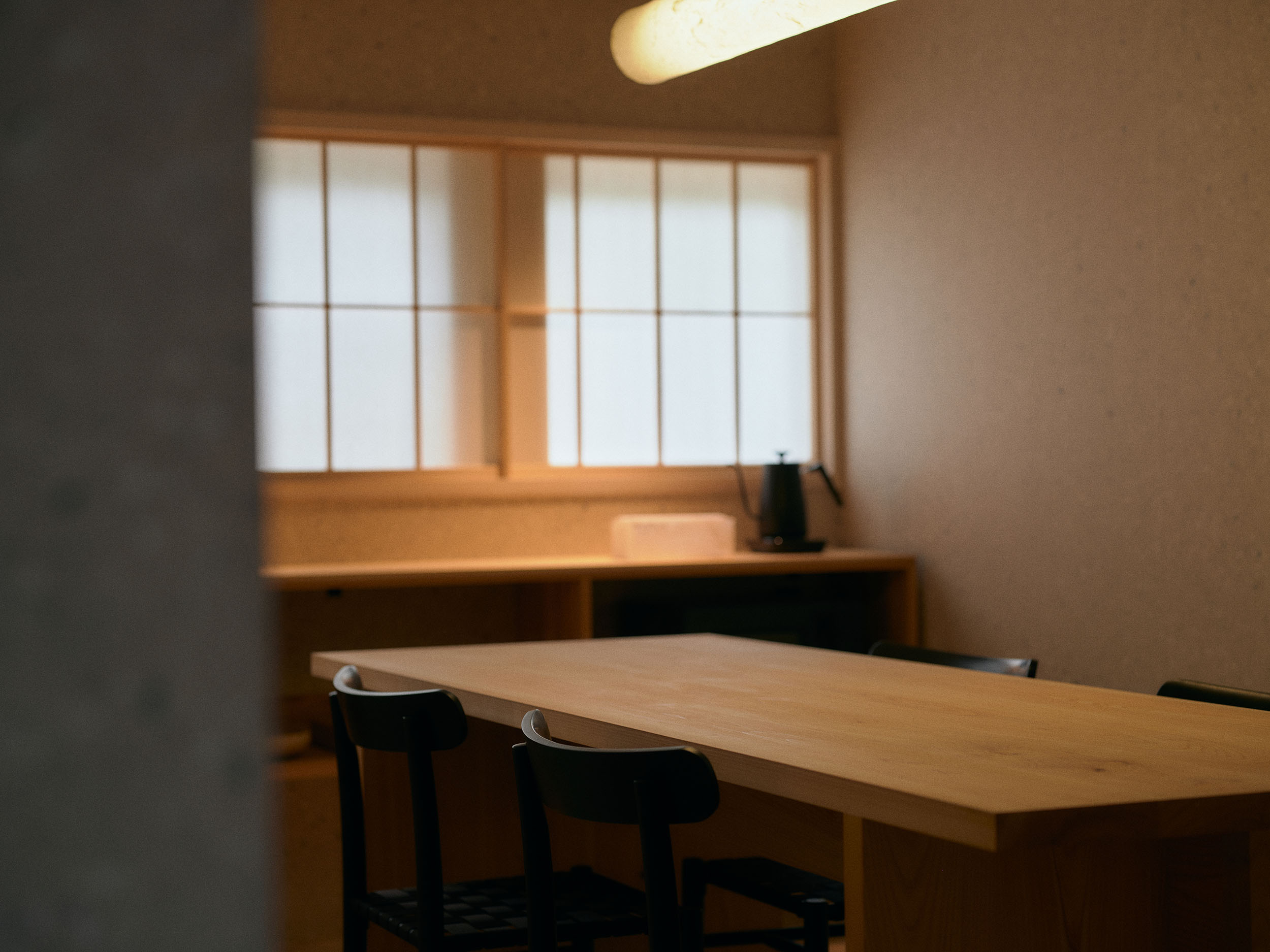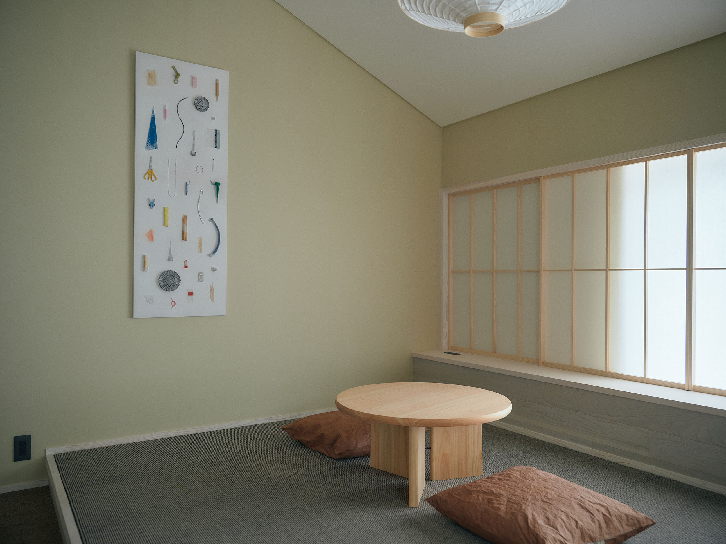 2人での滞在におすすめの「楮」は、二階の大きな窓から成願寺の参道を望み、光と風が心地よく通り抜けます。室内には、紙漉き道具を漉き込んだ滝製紙所・瀧英晃氏のアートワークが飾られ、和紙の息づかいを感じる空間となっています。