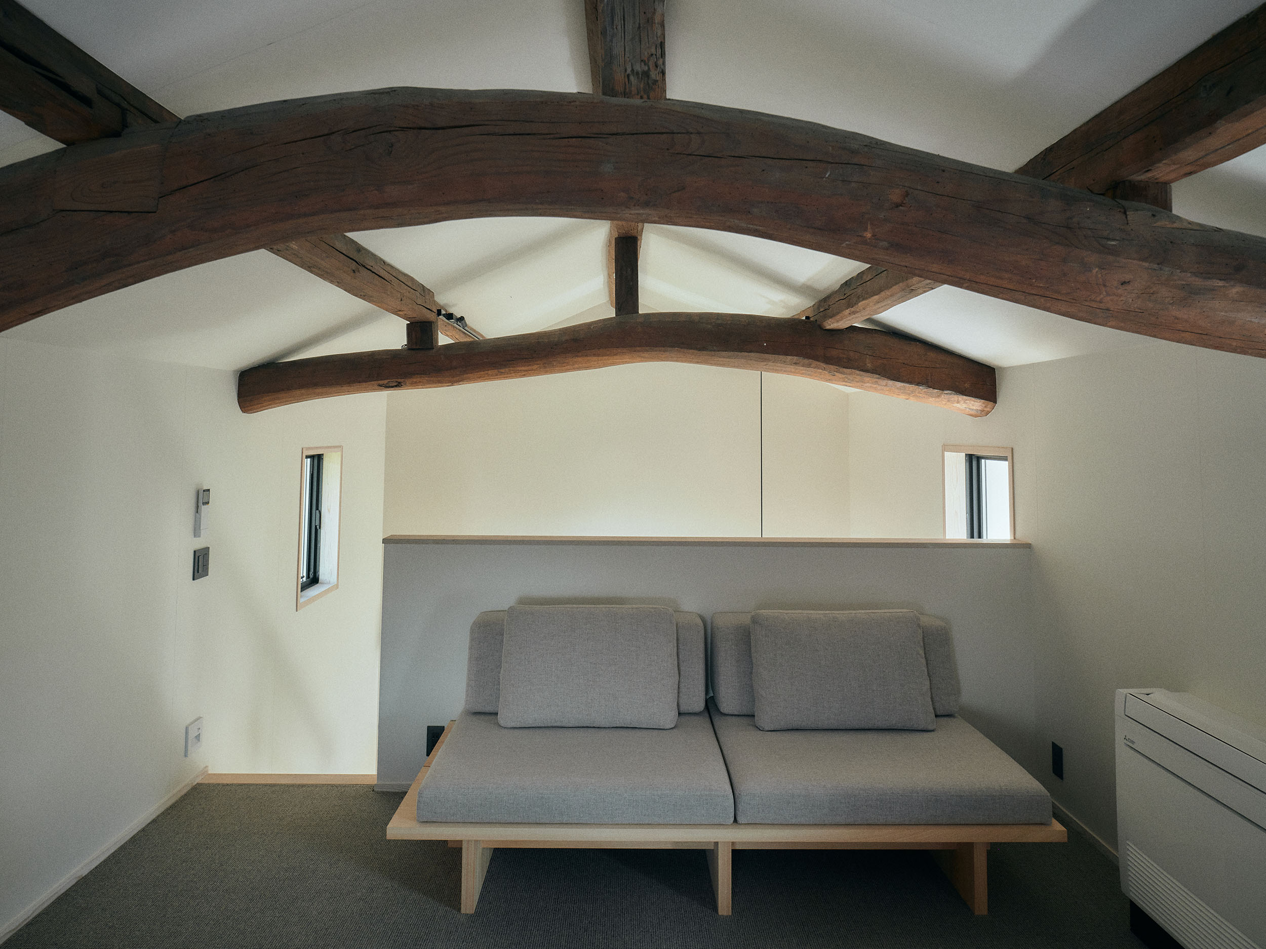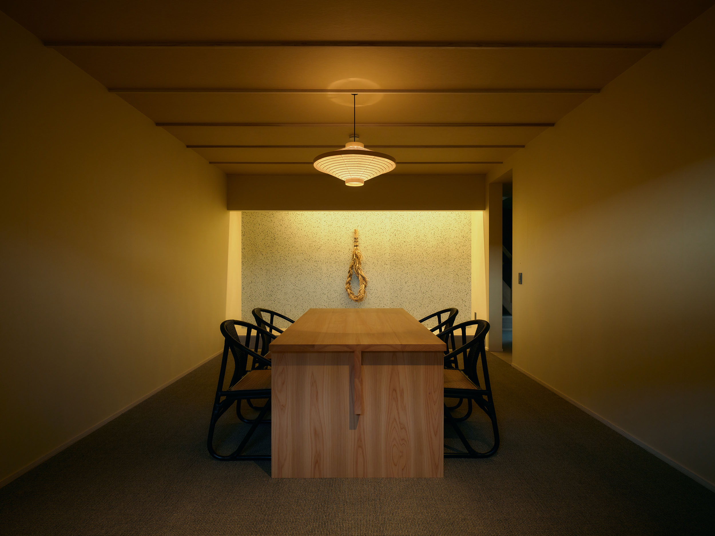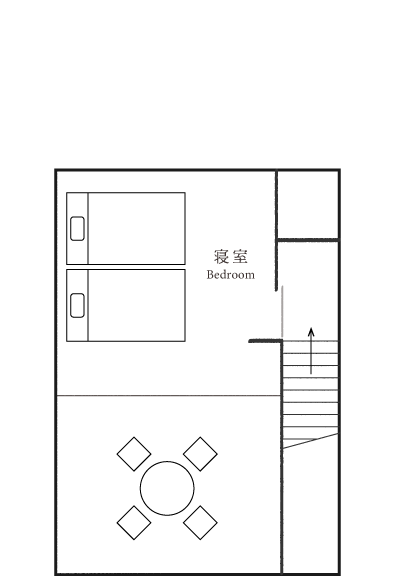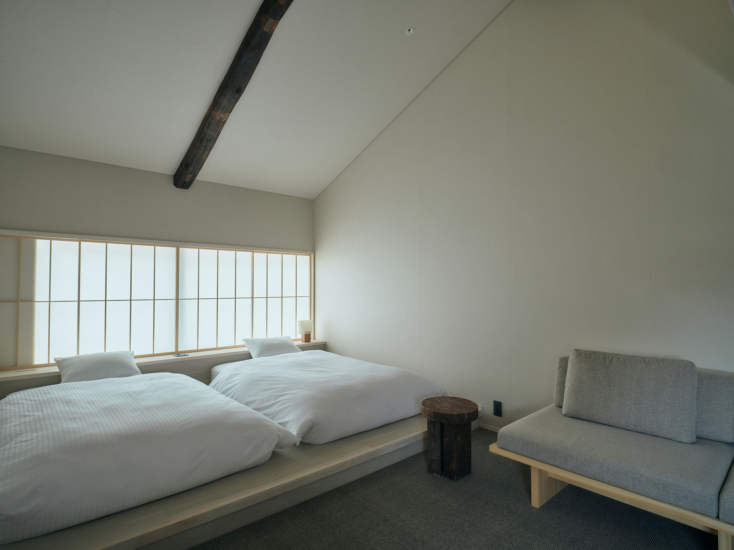 蔵を改修した一棟貸しの「雁皮」は、最大3名まで滞在できるプライベート空間。他の客室と離れており、静かな時間を過ごせます。吹き抜けの天井が開放感をもたらし、希少な雁皮にグラフィックデザインを施したアートワークが、空間に彩りを添えます。