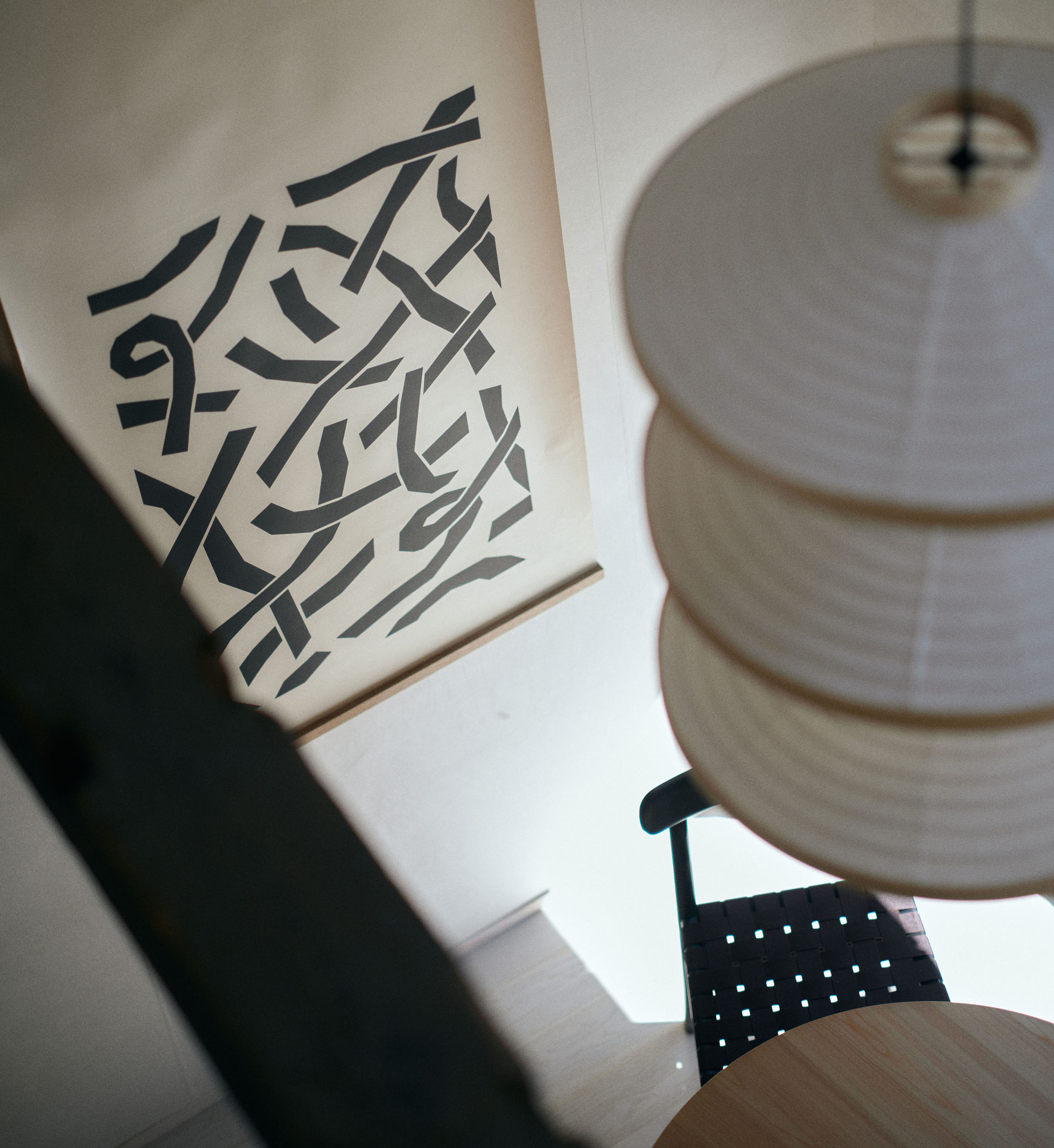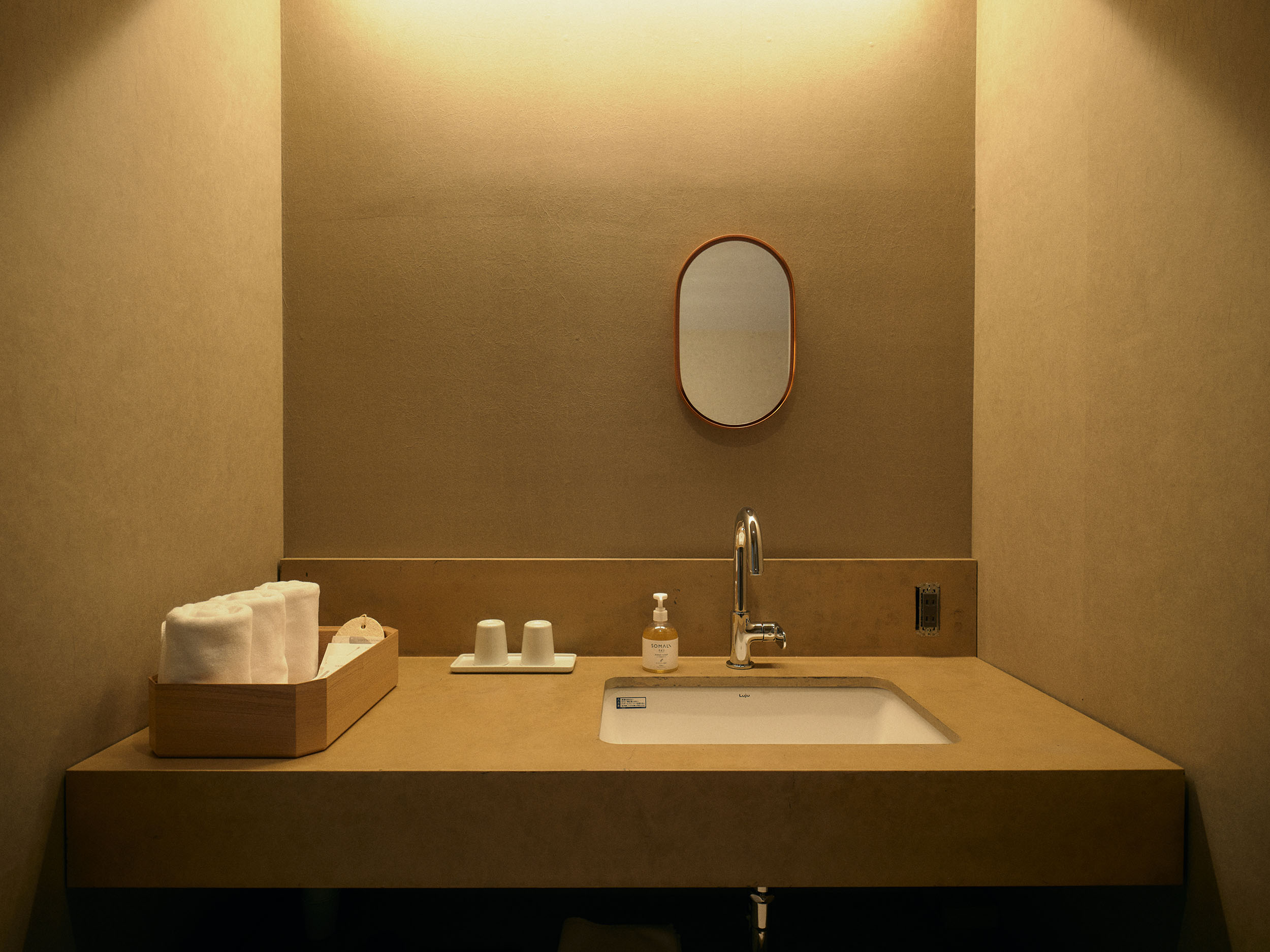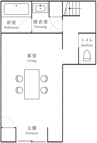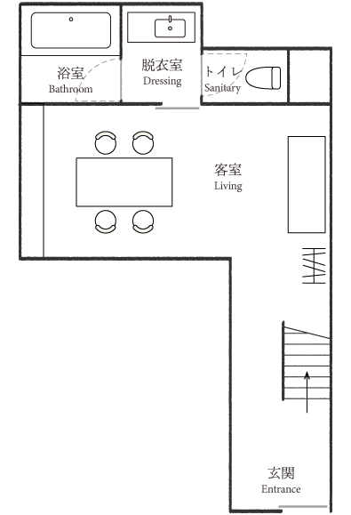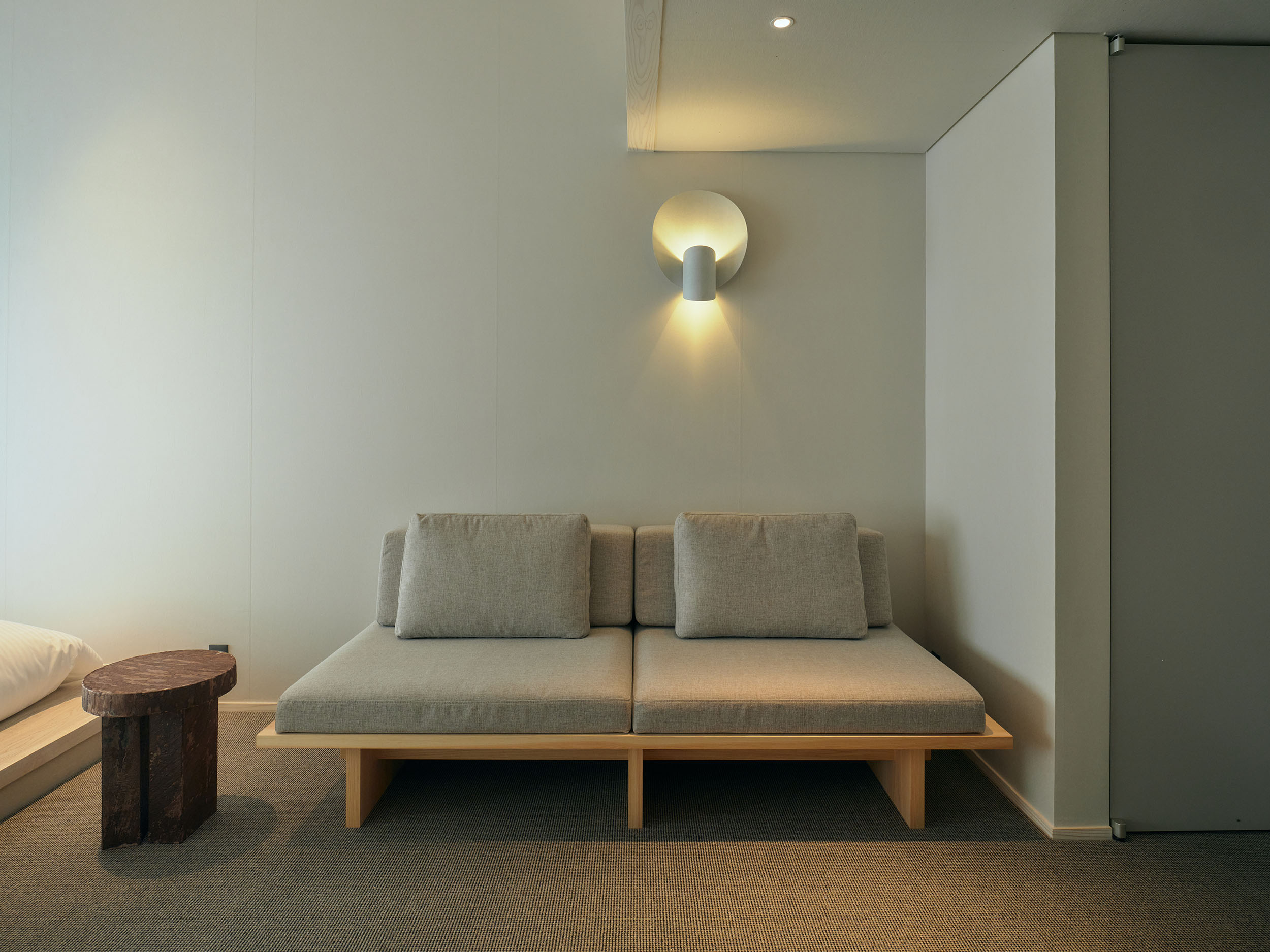 蔵を改修した一棟貸しの「雁皮」は、最大3名まで滞在できるプライベート空間。他の客室と離れており、静かな時間を過ごせます。吹き抜けの天井が開放感をもたらし、希少な雁皮にグラフィックデザインを施したアートワークが、空間に彩りを添えます。