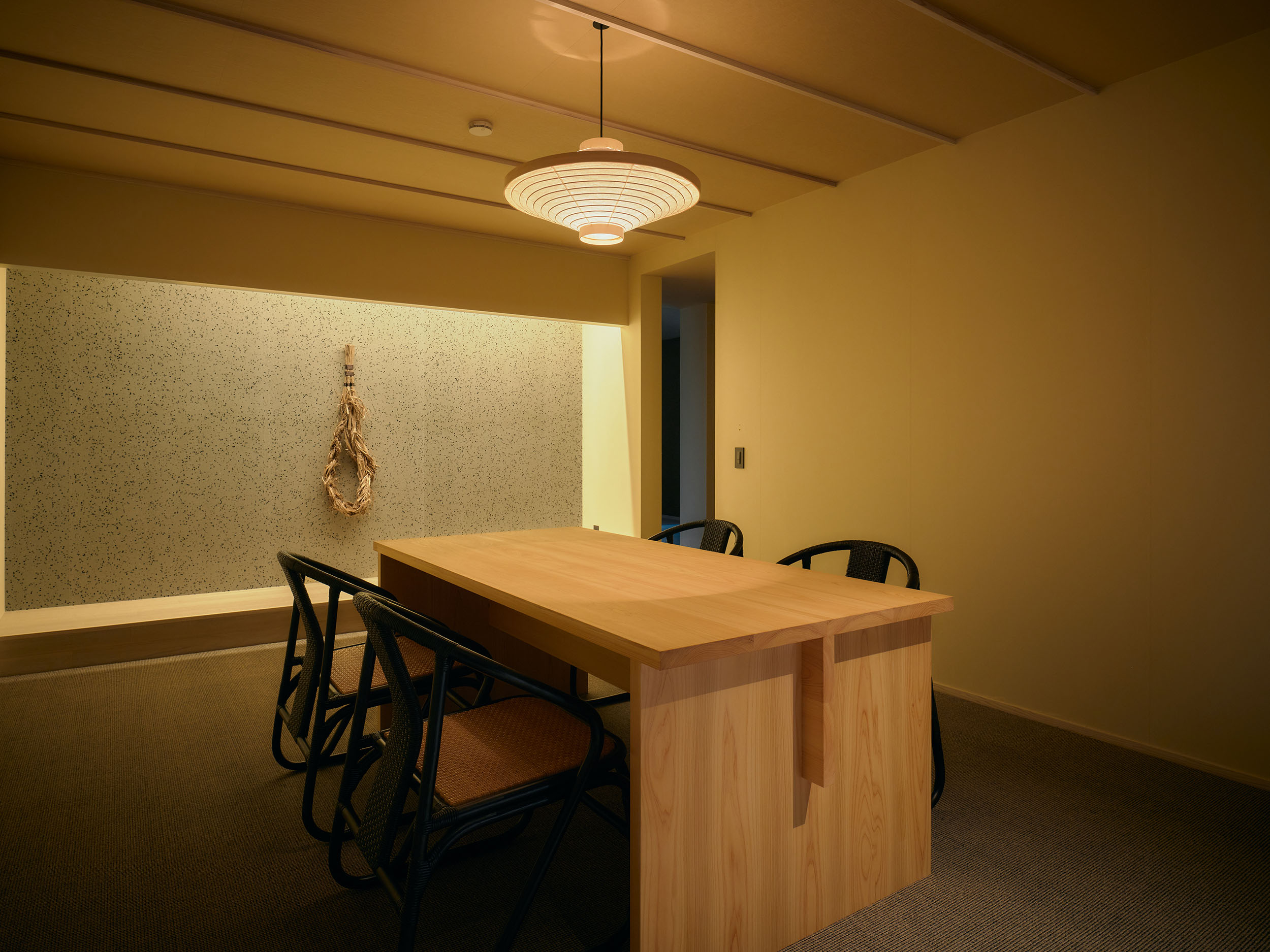 かつて豪商が使っていた古民家を改修した3つの客室。楮・三椏・雁皮を名に冠した客室では、和紙をテーマに、壁や天井から調度品まで越前の工芸に包まれる特別な空間が広がります。