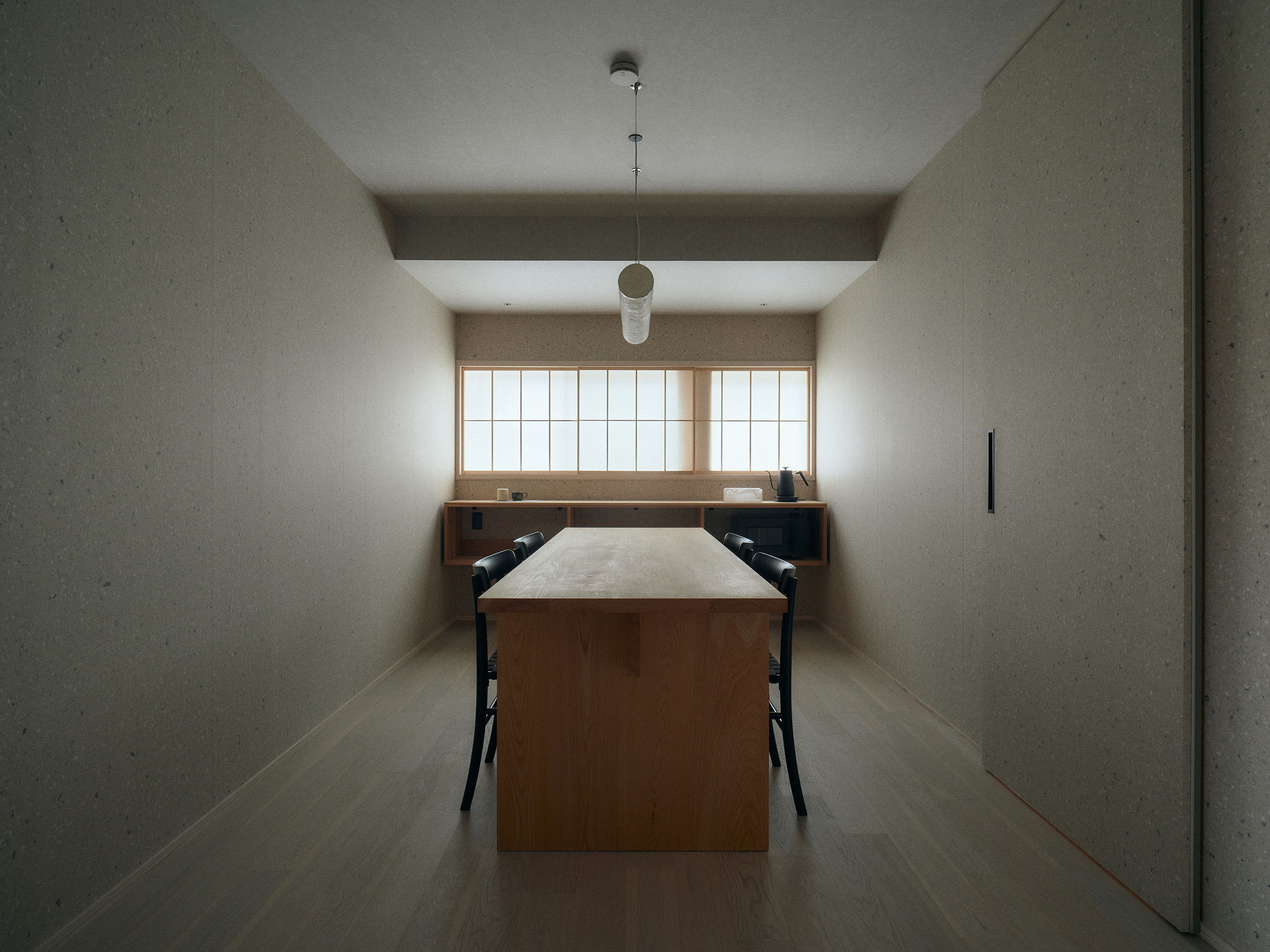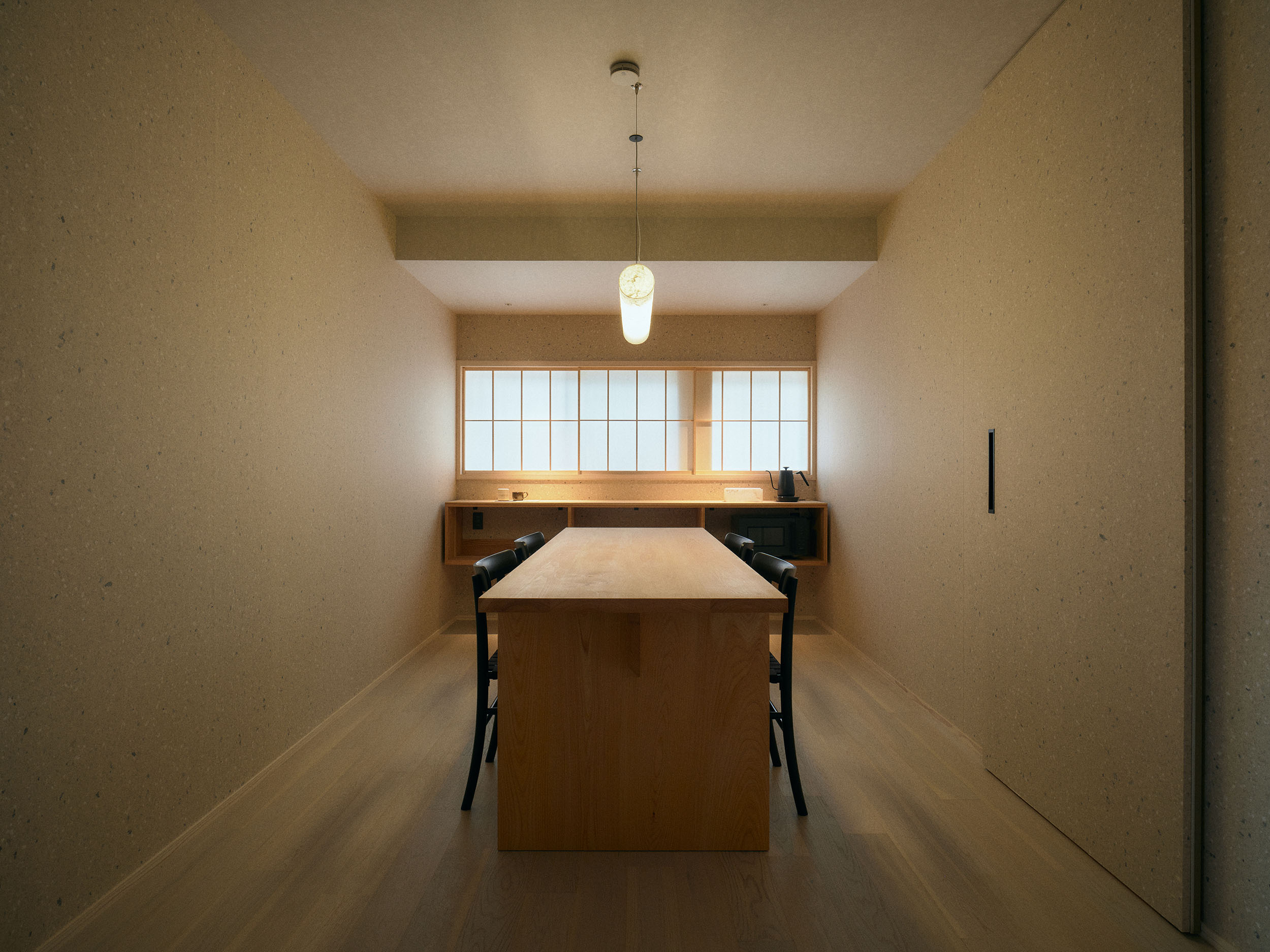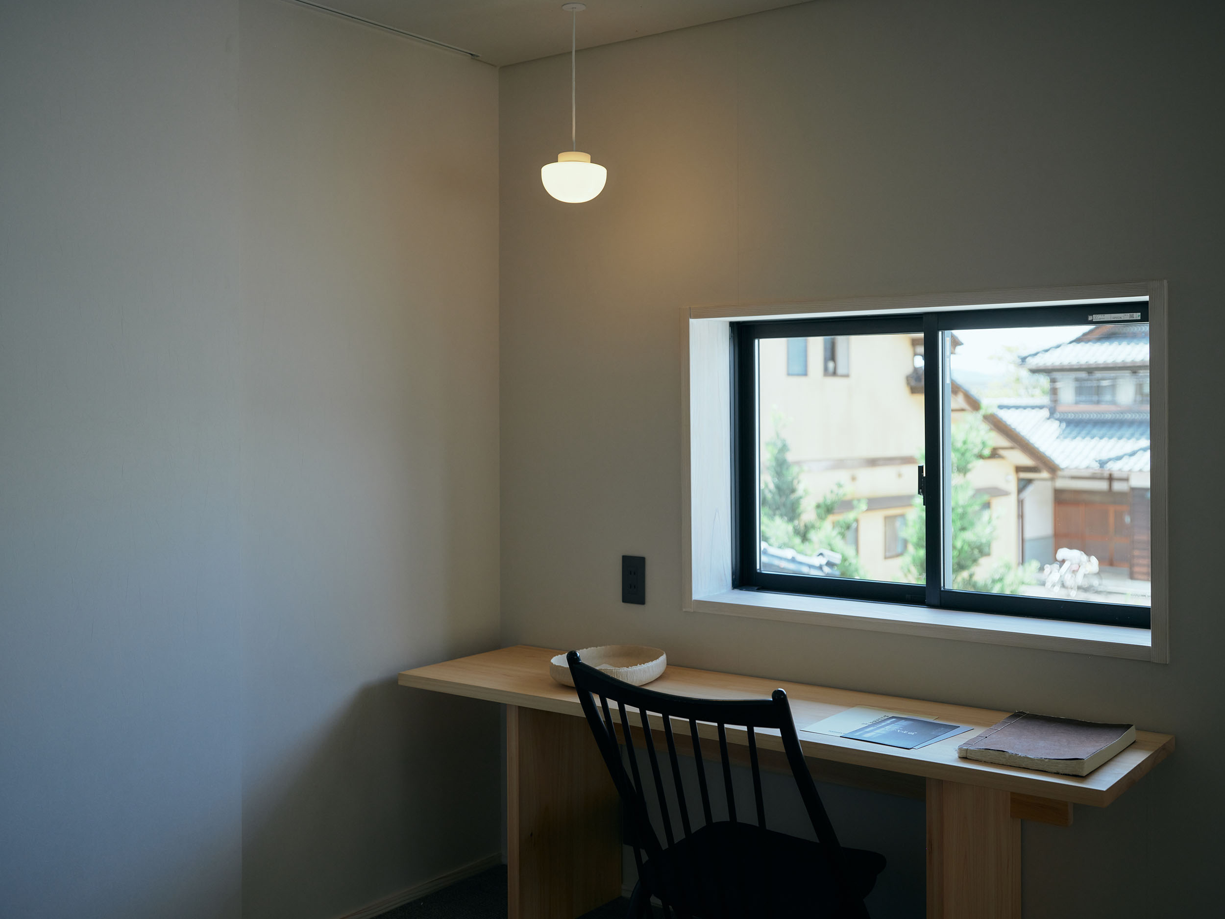 最大5名まで泊まれる「三椏」。二階には書斎を思わせる窓と机のスペースがあり、室内の壁は柴山修平氏と瀧英晃氏が手がけたオリジナル和紙で彩られています。三椏の原木を用いたアートが、自然の力強さと手しごとの息吹を宿します。