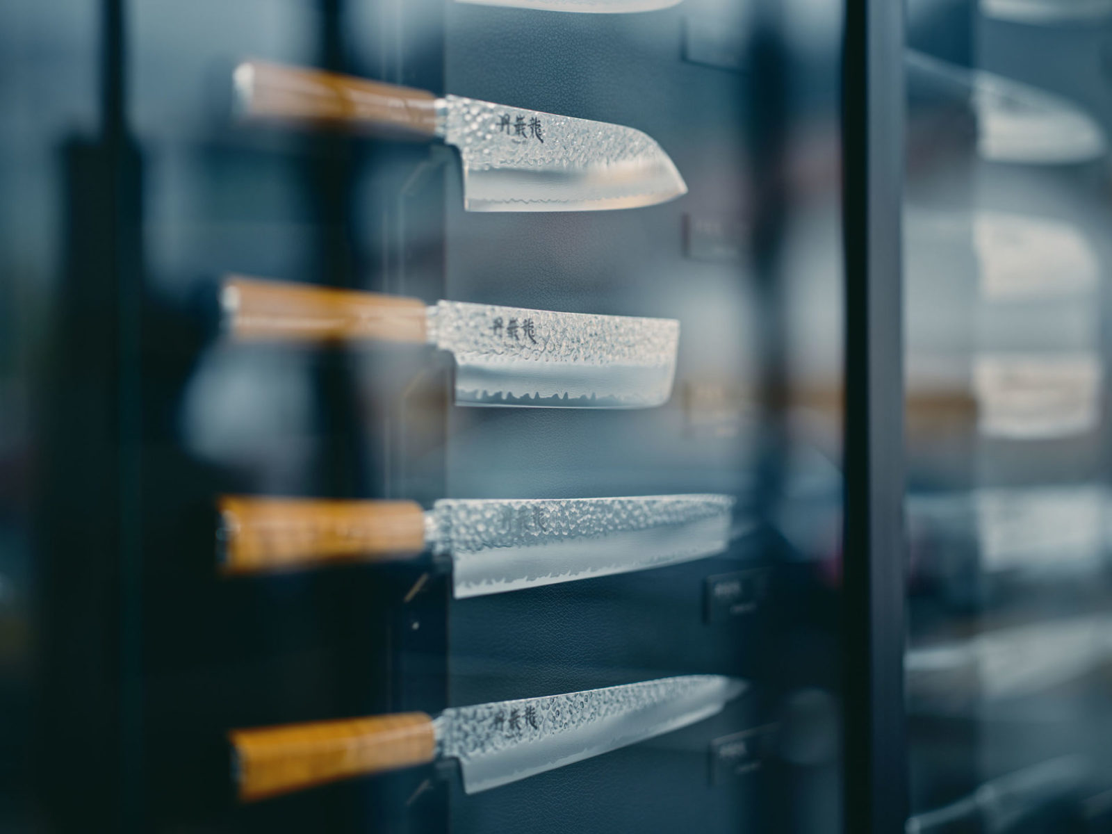 そのあとはショップへ。ショーケースに並べられた美しい包丁を見ながら、越前打刃物や龍泉刃物の軌跡、打刃物の製造方法等についてのお話を伺います。
