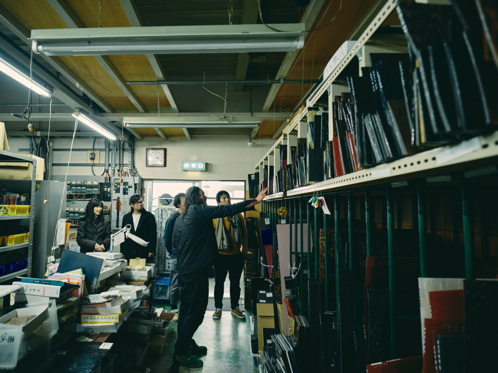 01材料と機械が部屋一面に並ぶ眼鏡工房を見学します